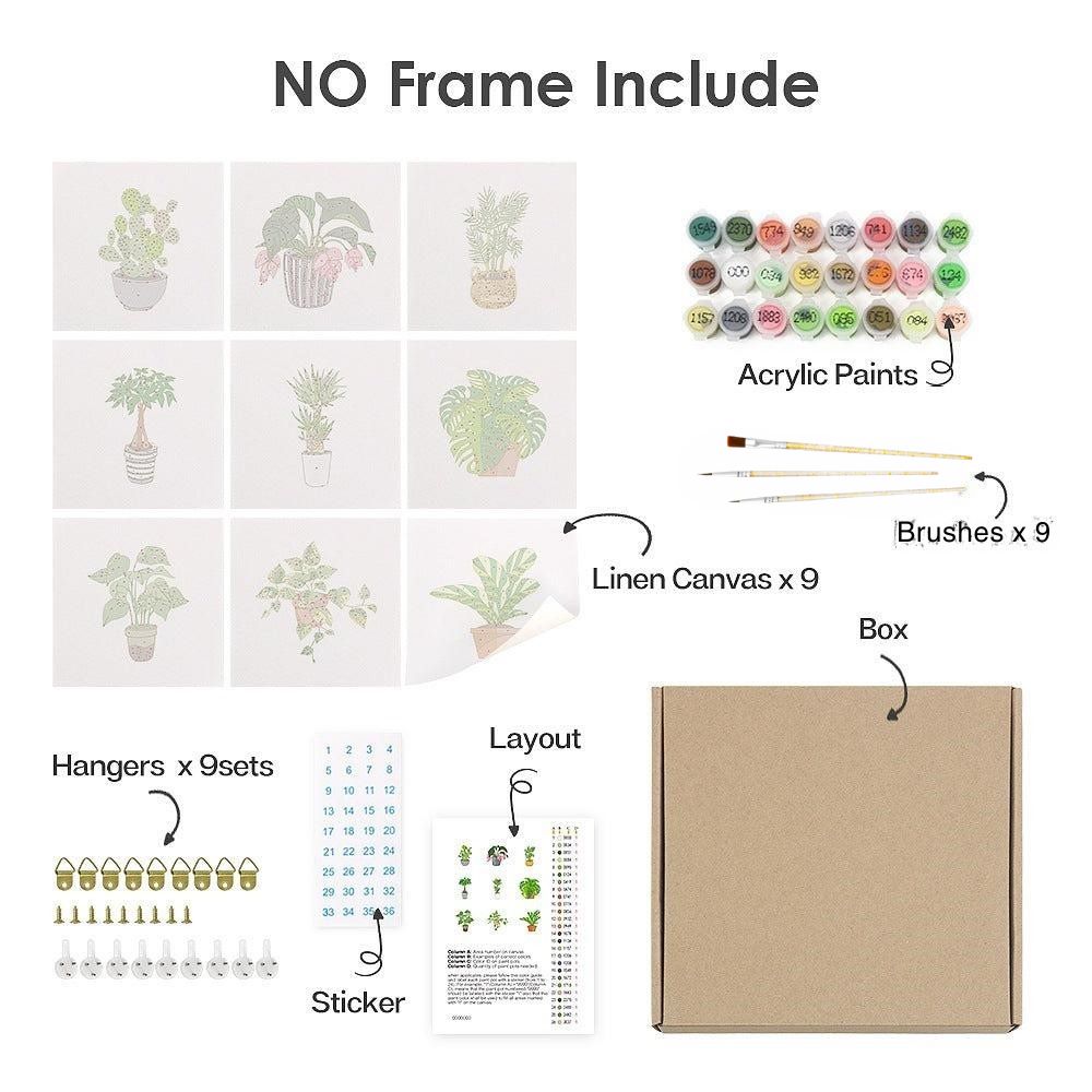 Perfect for plant lovers and art enthusiasts, this set includes nine small paint-by-number canvases, each featuring a unique and vibrant houseplant design. With each canvas measuring 15 x 15 cm, these mini masterpieces are ideal for adding a touch of nature to any corner of your home.