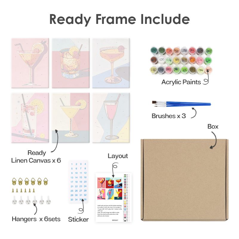 Move things forward with our 6 Mini Paintings - Fancy Cocktail Set! This beautiful set includes 6 vibrant mini paint-by-numbers, each depicting a different and classy cocktail.