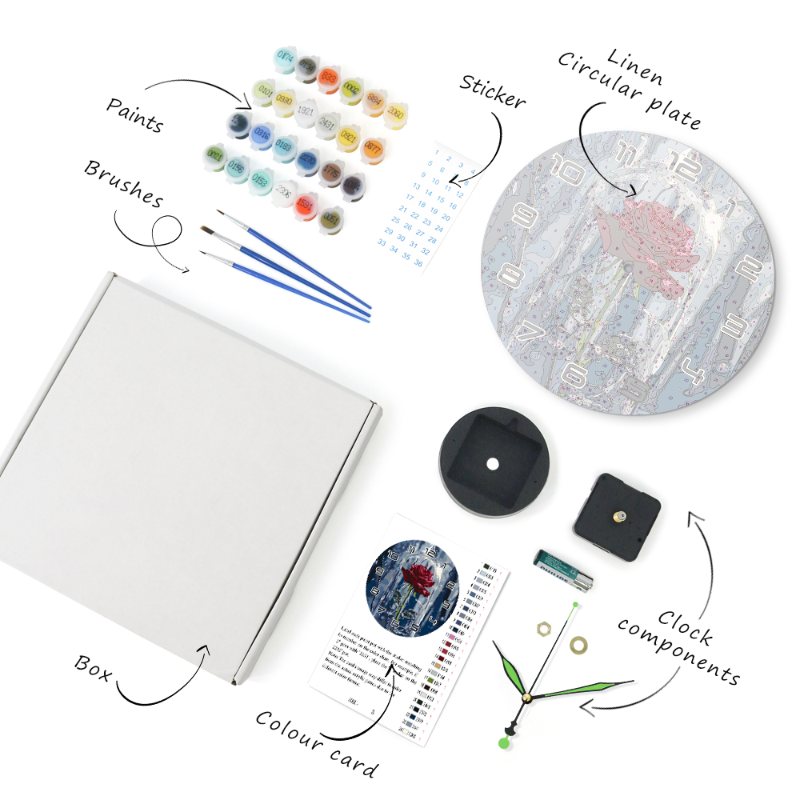 • Complete Kit – Includes acrylic paint, high-quality brushes, a pre-printed acrylic plate, and a clock mechanism.
